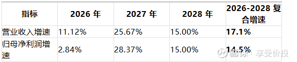 结合中国银河证券对公司 2025-2027 年的精准预测,及 2028 年行业增速对公司的传导效应,机构对公司 2026-2028 年营收、归母净利润增速的一致预期如下表: