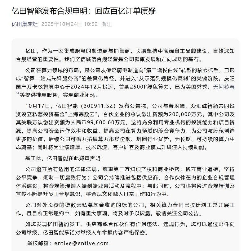 亿田官方账号发布声明,回应百亿订单质疑!