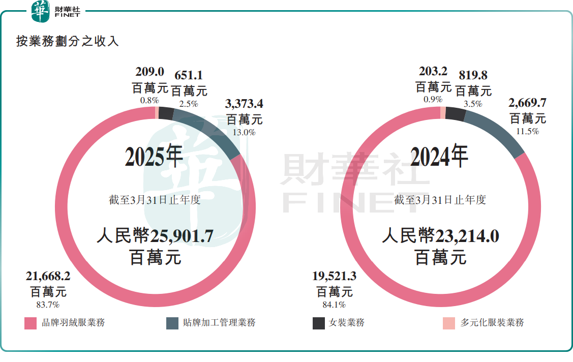 众所周知,波司登是靠羽绒服起家的。2025财年,波司登品牌羽绒服业务仍为集团的收入主力军,年内实现收入约216.69亿元,占总收入的83.7%,同比上升11.0%。
