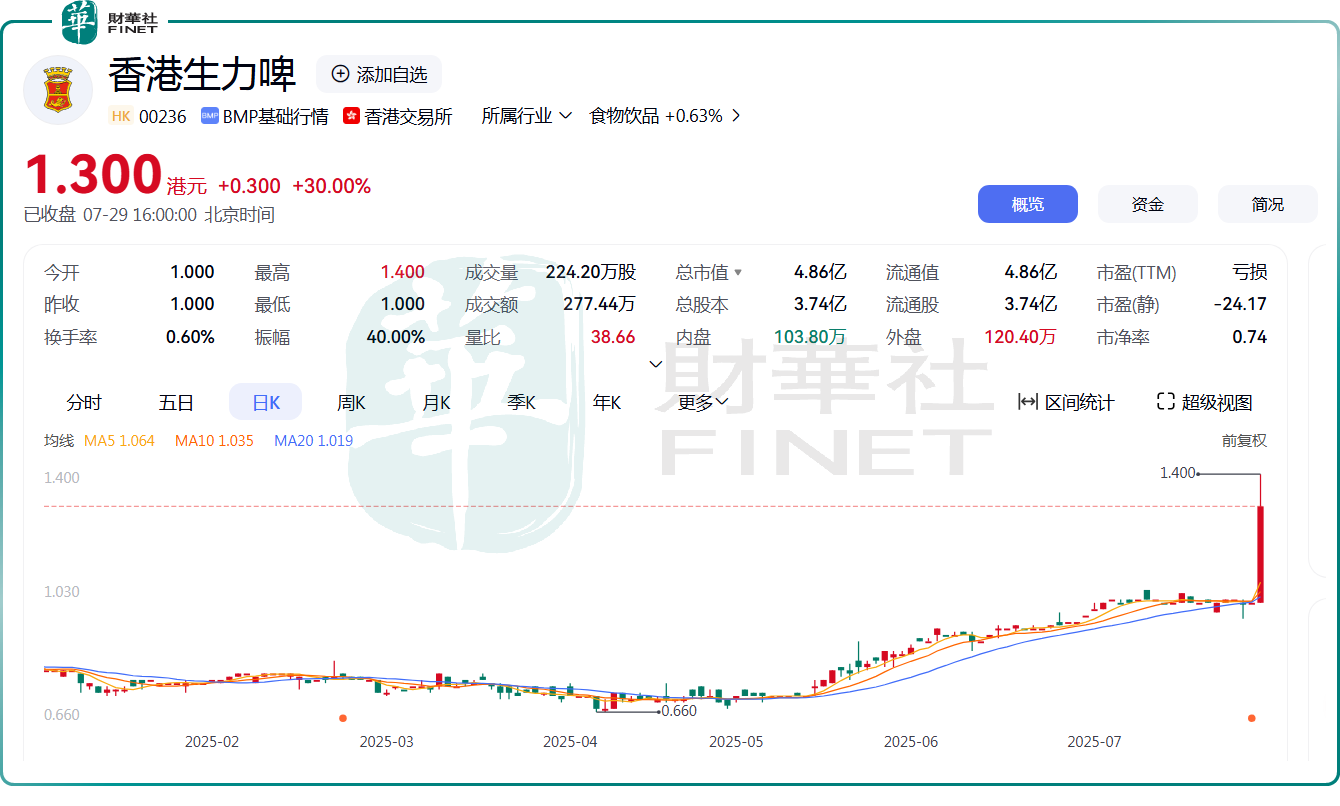 7月29日,$香港生力啤(00236)$ 股价大幅拉升,盘中一度涨40%,截至收盘涨幅为30%,报1.3港元/股。
