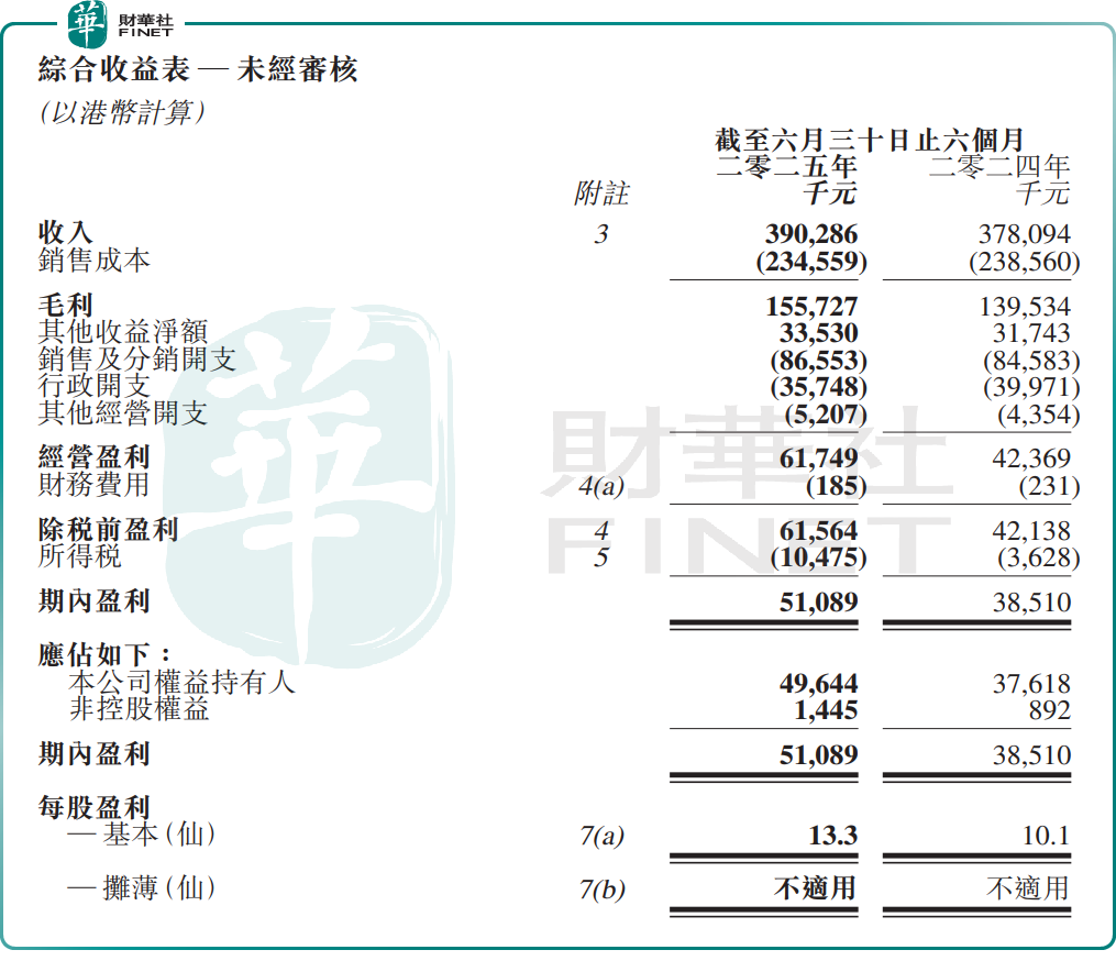 报告期内,公司实现收入约3.90亿港元,同比增长3.22%;归母净利润为4964.4万港元,同比大幅增长31.97%;毛利率提升至39.9%,较2024年同期增加3个百分点。