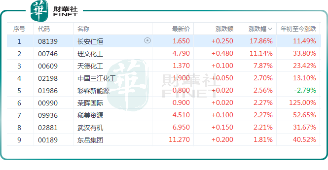 在理文化工带动之下,化工用品概念板块整体都呈现上扬态势。其中,$长安仁恒(08139)$ 大涨17.86%,$天德化工(00609)$ 涨7.87%,中国三江化工(02198.HK)涨2.7%,彩客新能源(01986.HK)、东岳集团(00189.HK)等概念股均纷纷飘红。