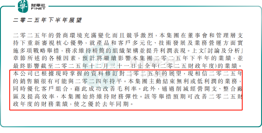 富智康集团还指出,上半年营商环境充满变化且竞争激烈等因素预计将继续影响集团下半年的业绩。集团已经修订对2025年的展望,预期2025年的销售额很可能与2024年持平。集团主动结束无利或低利润的业务,同时优化客户组合,成功改善了毛利率。此外,通过削减经营开支、整合厂区及提高效率,集团始终维持财务弹性。这些举措预期可改善2025年的财务业绩,使其优于去年同期。