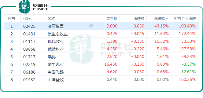 截至收盘,$澳亚集团(02425)$ 飙升43.15%,年内累涨103.48%;$原生态牧业(01431)$也上涨了11.84%,年内涨幅达172.44%;$现代牧业(01117)$ 涨10.32%,优然牧业(09858.HK)涨5.46%,澳优(01717.HK)、蒙牛乳业(02319.HK)、中国飞鹤(06186.HK)等也纷纷跟涨。
