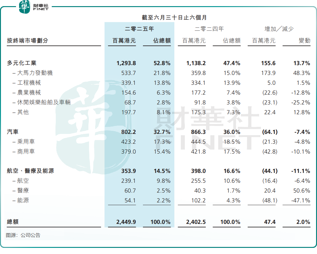 按终端市场划分,则分为多元化工业,汽车,航空、医疗及能源,其中多元化工业又分为大马力发动机、工程机械、农业机械、休闲娱乐船舶及车辆、其他。