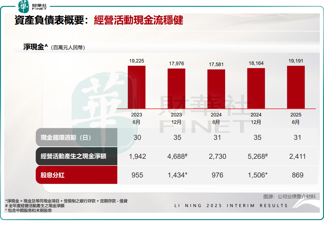 今年上半年,公司经营现金净流入为24.11亿元,6月底现金及等同现金项目达117.98亿元,较上年末增加近43亿元。现金流稳健的李宁,保持较高的派息比率,公司宣派末期股息每股33.59分人民币(上年同期为37.75分人民币),中期派息率为50%。