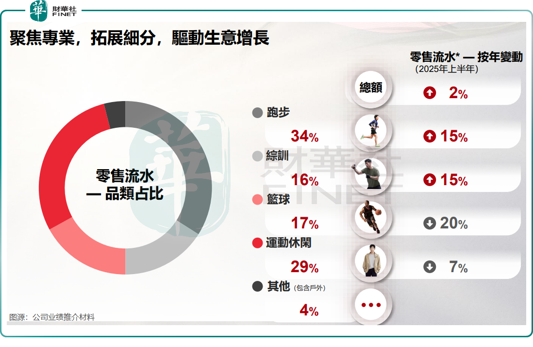 但篮球品类当前面临低迷的市场环境,近几年来收入表现不佳,今年上半年零售流水同比下滑了20%;运动休闲品类零售流水也同比下滑7%。