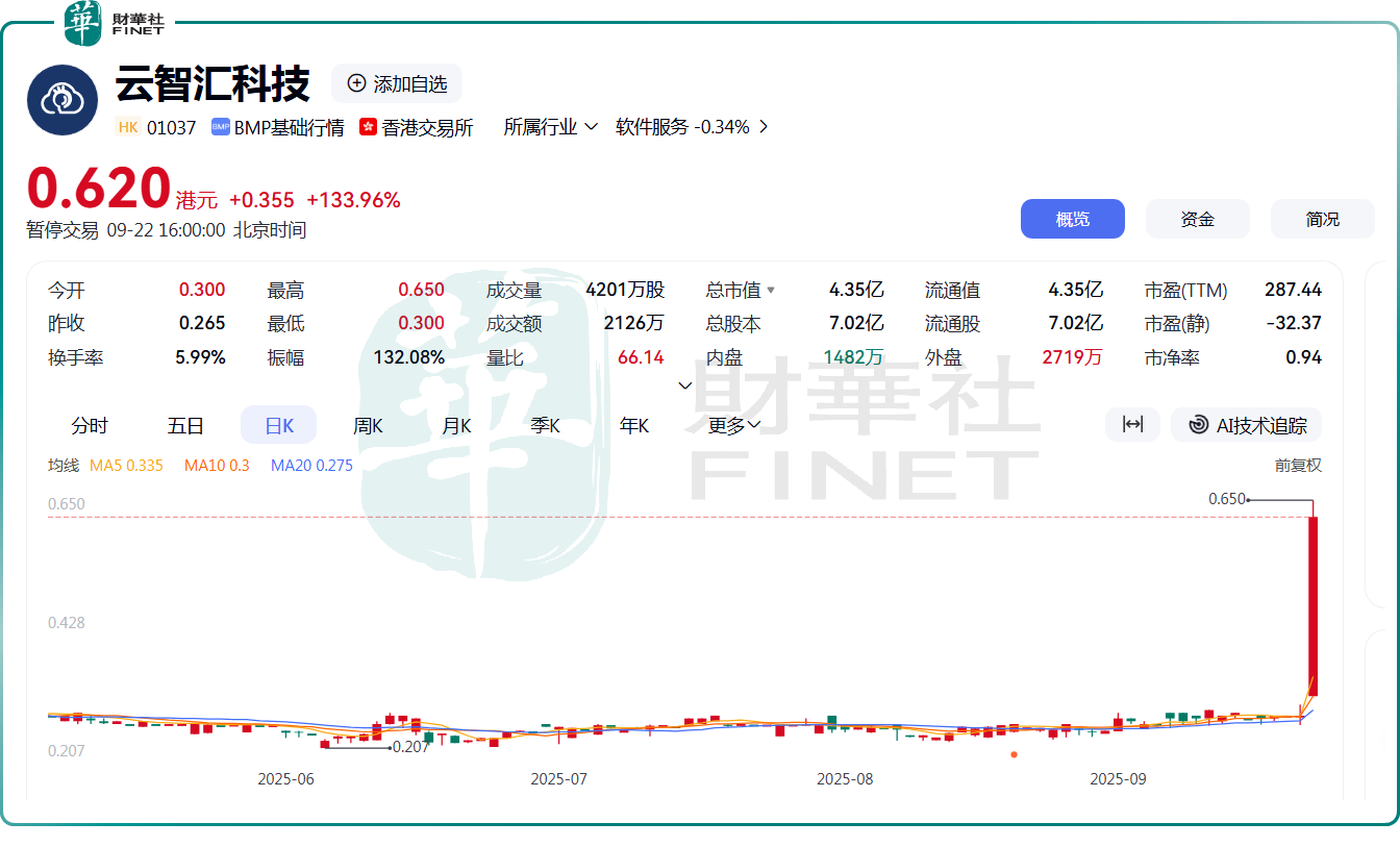9月22日,$云智汇科技(01037)$ 成为港股涨幅榜的焦点。开盘后,该股价一路飙升,于上午10时32分触发临时停牌机制。停牌前该股报0.62港元/股,涨幅达133.96%,强势登顶港股涨幅榜榜首。但总市值相对“mini”,仅有4.35亿港元。