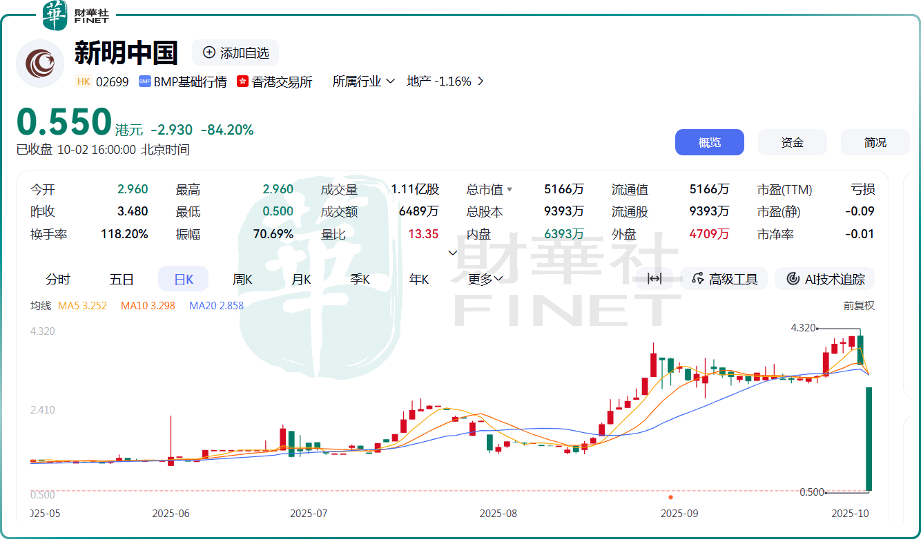 10月2日,$新明中国(02699)$ 开盘股价便大幅跳水,并迅速冲上港股跌幅榜榜首。最终,该股以跌幅84.2%收盘,股价定格在0.55港元,跌入“仙股”行列。