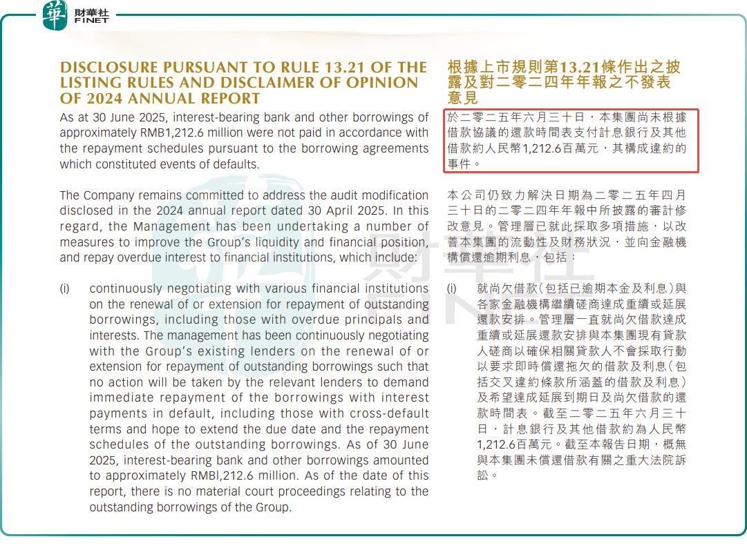 债务违约方面,财报指出,于2025年6月30日,新明中国尚未根据借款协议的还款时间表支付计息银行及其他借款约人民币12.12亿元,其构成违约的事件。