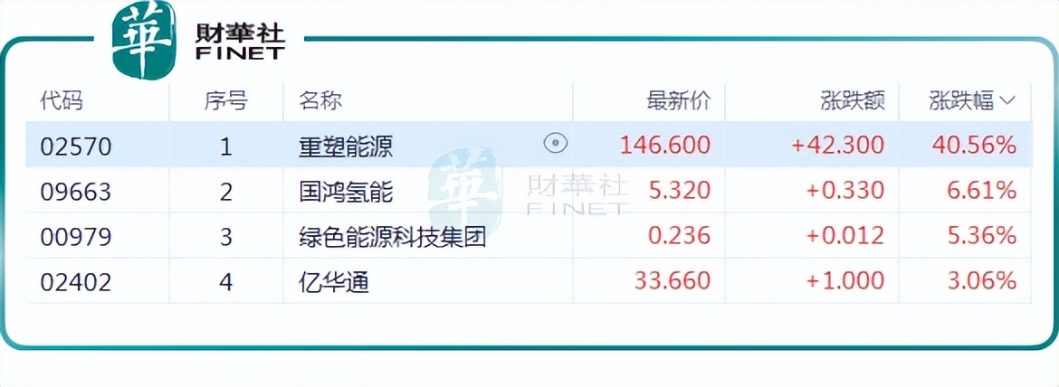 在港股阵营,截至收盘,$重塑能源(02570)$ 表现最为突出,涨幅达40.56%;$国富氢能(02582)$ 涨6.7%,$国鸿氢能(09663)$ 涨6.61%,亿华通(02402.HK)涨3.06%,中集安瑞科(03899.HK)、京城机电股份(00187.HK)等氢能源概念股跟涨。