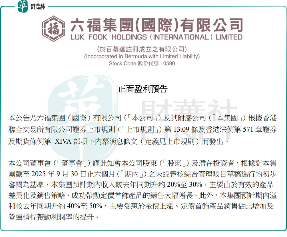 11月20日港股盘后,六福集团发布2025年上半财年(截至2025年9月30日止6个月)盈喜公告,预计收入将同比增长约20%至30%,利润将同比增长约40%至50%。