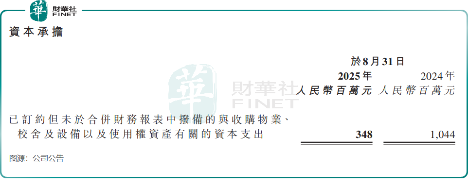 除了核心盈利指标增速跑赢行业,公司资本开支的下降也带动了自由现金流的释放。于2025年8月底,公司现金储备达67.44亿元,完全覆盖短期流动性需求;同时,资本开支从上一财年的48.57亿元大幅降至26.6亿元,已签约未拨备的资本承担也从上一财年的10.44亿元降至3.48亿元,预示着未来自由现金流释放潜力巨大。