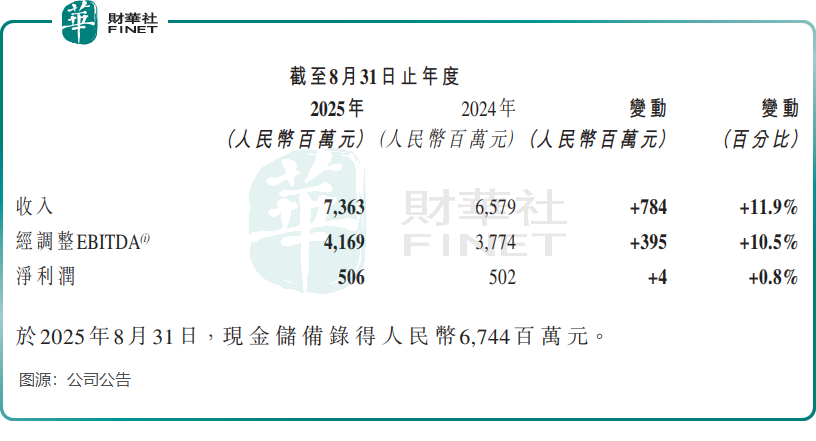 在校生规模的持续扩大,直接驱动了公司营收增长。2025财年,中教控股实现收入73.63亿元(单位人民币,下同),同比增长11.9%,这一增速继续领跑行业平均水平,凸显了头部企业在存量竞争时代的“虹吸效应”。受税项增加影响,公司净利润同比基本持平,为5.06亿元;但反映核心经营状况的经调整EBITDA同比增长10.5%,达到41.69亿元。