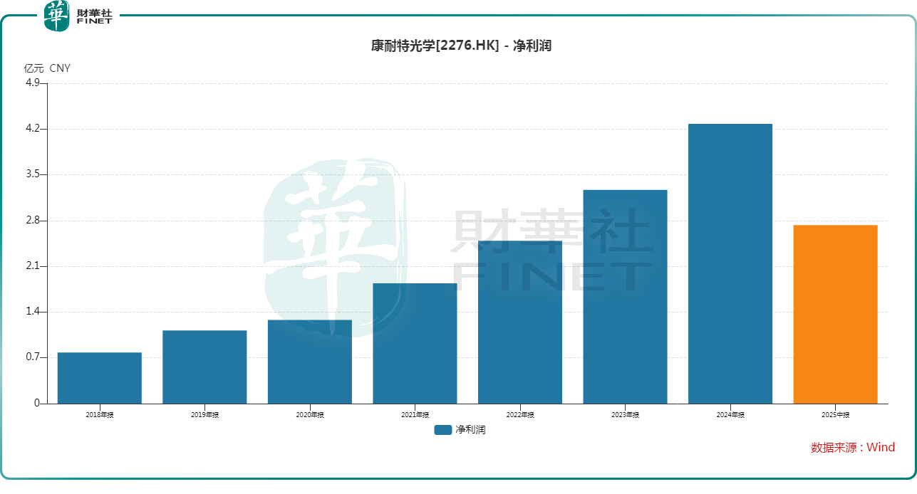 到了2025年中期,康耐特光学的收入约为10.84亿元(人民币,下同),同比11%;归母净利润约2.73亿元,同比增长31%。