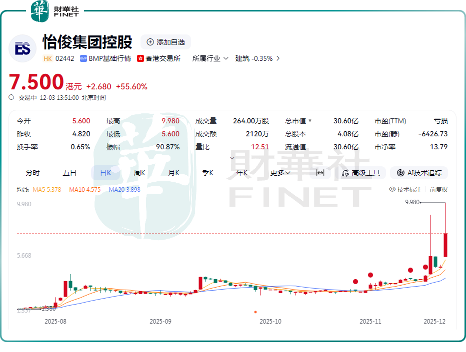 12月3日,$怡俊集团控股(02442)$ 复牌即上演股价暴动,盘中一度涨逾107.05%,报9.98港元/股,创下公司上市以来股价新高。截至发稿前,该股仍维持强势,报7.50港元/股,涨幅为55.60%。