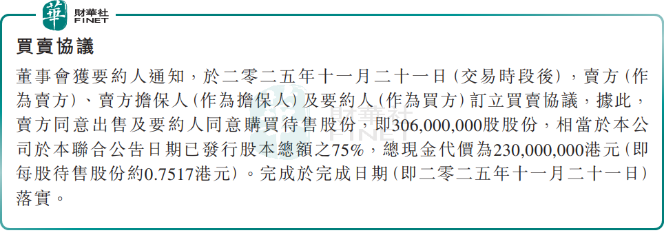 12月2日,怡俊集团控股公告,于2025年11月21日,天赋国际集团有限公司向鼎润投资有限公司完成收购3.06亿股股份,相当于公司于联合公告日期已发行股本总额的75%,总现金代价为2.3亿港元。