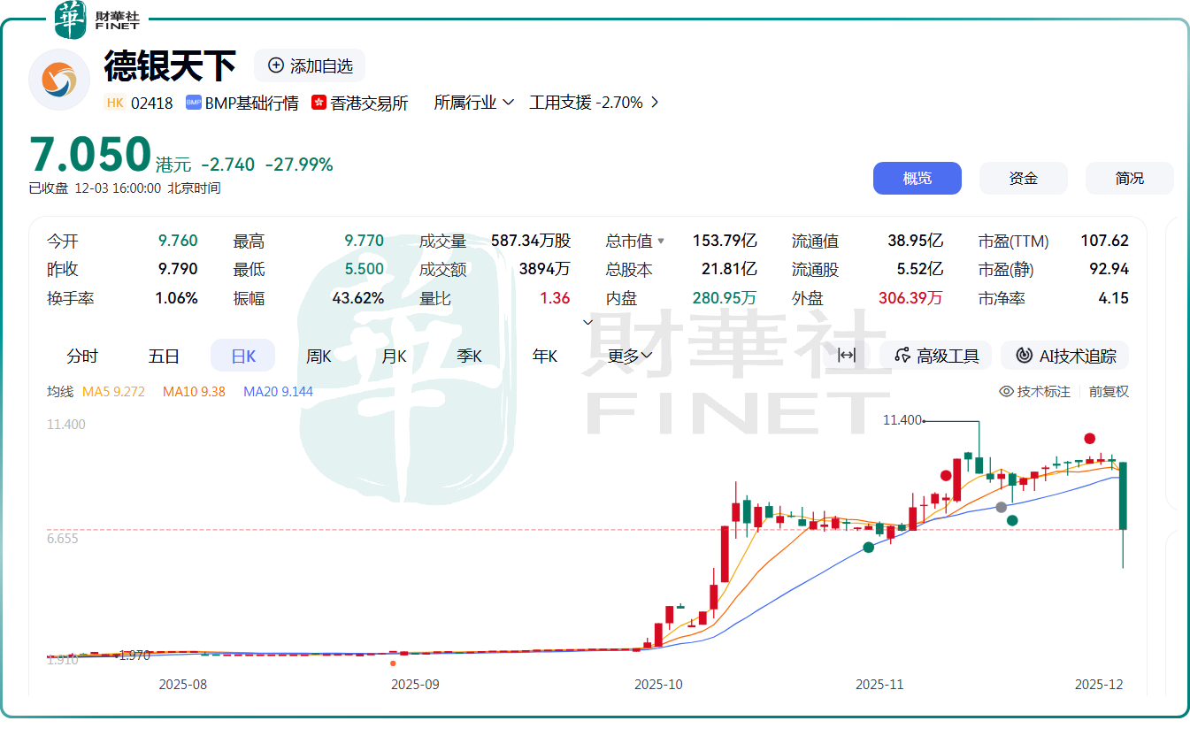 12月3日,$德银天下(02418)$ 股价大幅跳水,一路下探,跻身港股跌幅榜前列;截至收盘,该股跌幅达27.99%,报7.05港元/股。