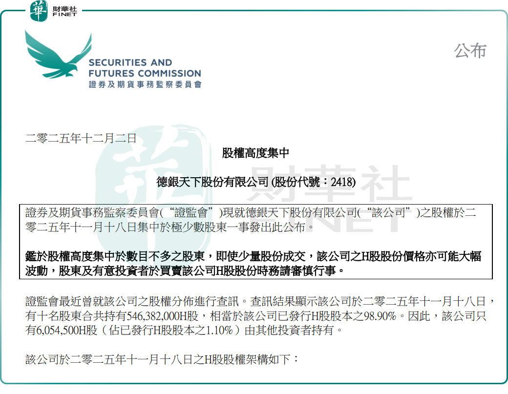 消息面,12月2日,香港证监会一纸公告揭开了德银天下的“股权高度集中”的隐忧,给投资者敲响了一记警钟。