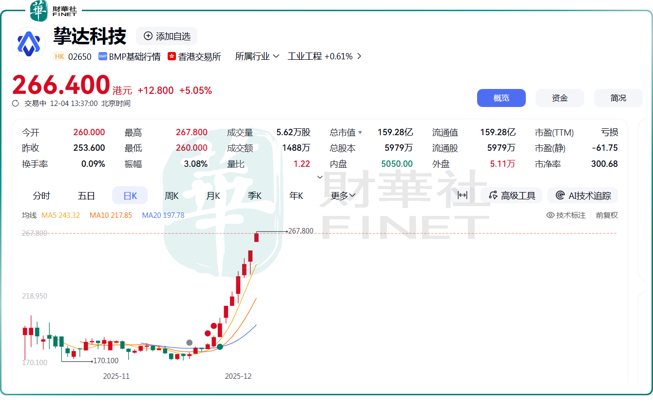 但自11月下旬开始,挚达科技便跟打了鸡血似的,股价持续冲高,目前已实现9连涨,累计涨幅接近5成;若相较于66.92港元/股的上市发行价,公司当前股价累计涨幅已高达298.09%。