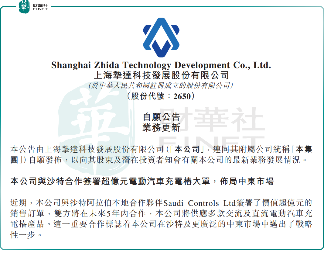 消息面,挚达科技近日公布,与沙特本地合作伙伴 Saudi Controls Ltd 签署价值超亿元的充电桩大单,双方将在未来5年内合作,挚达科技将供应多款交流及直流充电桩产品。