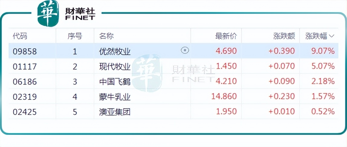 在港股市场,截至发稿前,$优然牧业(09858)$ 大涨9.07%,$现代牧业(01117)$ 涨5.07%,$中国飞鹤(06186)$ 涨2.18%,蒙牛乳业(02319.HK)等均涨。