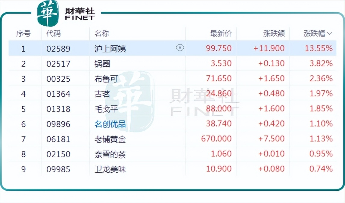 12月15日,港股多家新消费股走强。截至发稿前,$沪上阿姨(02589)$ 表现最为突出,涨幅达13.55%;$锅圈(02517)$ 涨3.82%,$布鲁可(00325)$ 涨2.36%,古茗(01364.HK)涨1.97%,毛戈平(01318.HK)涨1.85%,名创优品(09596.HK)、奈雪的茶(02150.HK)、上美股份(02145.HK)等公司亦出现不同程度上涨。