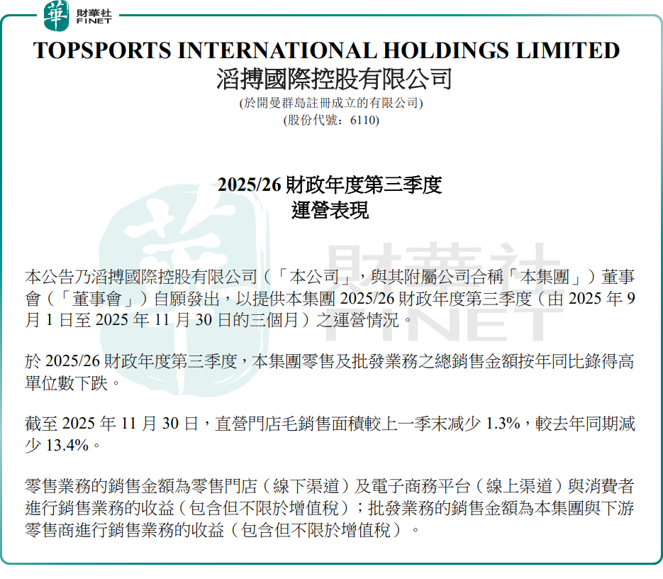 公告显示,滔搏国际2025/26财年第三季度,零售及批发业务之总销售金额同比录得高单位数下跌,延续了第二季度(同比高单位数下跌)的疲软态势。