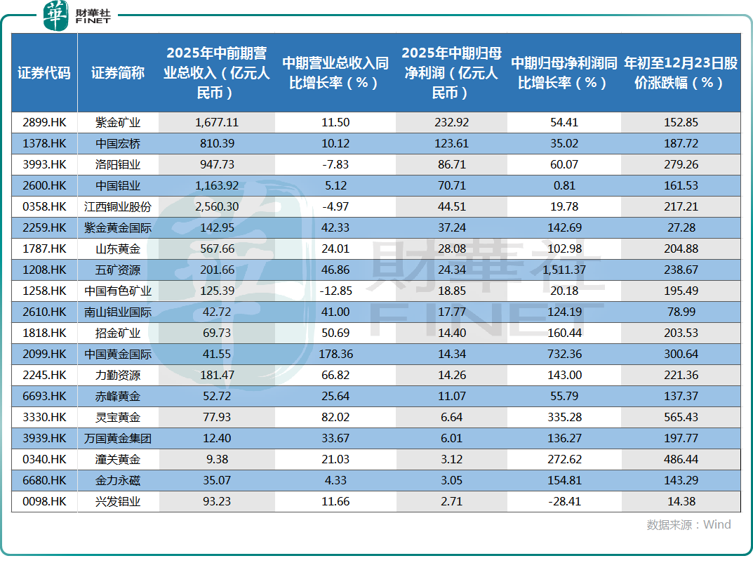 由于多数港股企业还未披露2025年第三季度的业绩,因此从中期归母净利润的边际变化来看,包括紫金黄金国际(02259.HK)、山东黄金(01787.HK)、中国黄金国际(02099.HK)在内的黄金概念股在今年上半年取得了优异成绩,归母净利润大多实现翻倍增长。