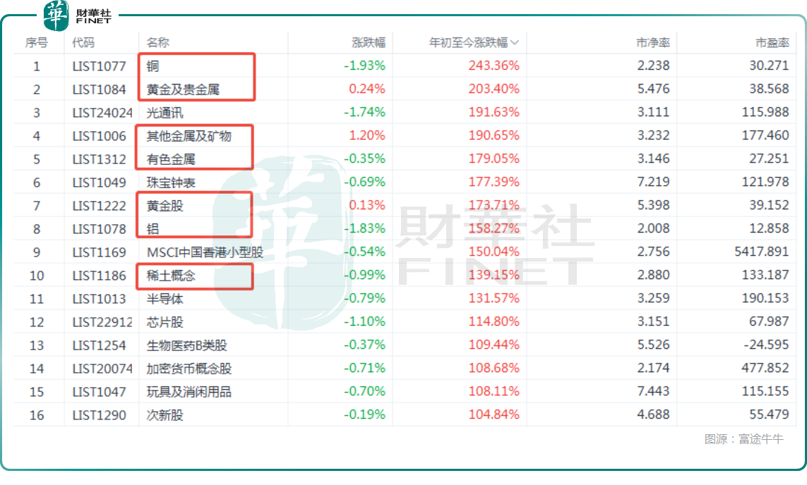 而在港股,铜板块年内累涨逾243.33%,位居市场第一,黄金及贵金属、其他金属及矿物、有色金属、黄金股、铝、稀土都涨逾130%,都位列板块涨幅前十。
