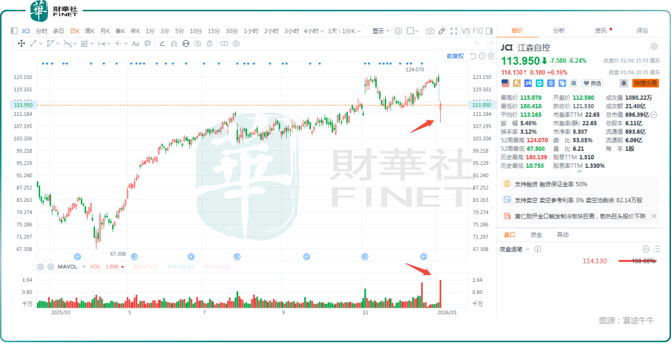 数据显示,周二(美东时间),$江森自控(JCI)$ 一度暴跌近11%,创2022年以来最大盘中跌幅,最终跌幅收窄至6.24%,但成交量出现显著放大;$摩丁制造(MOD)$ 也爆量收跌7.46%;特灵科技(TT.US)同样走低。