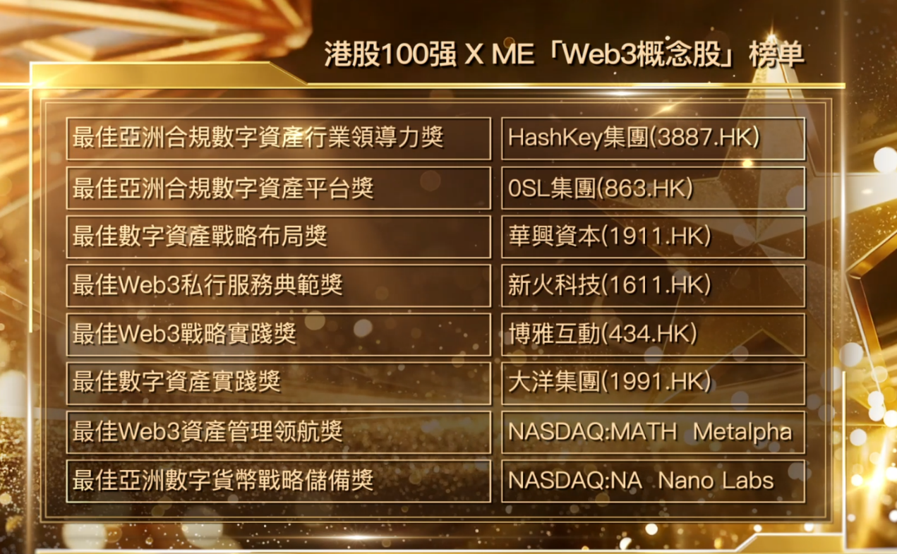 聚焦数字资产新生态,确立行业合规新标杆。2026年1月9日,由港股100强研究中心主办,财华社、ME、富途证券协办的“2025香港财富管理高峰论坛暨第十二届港股100强颁奖典礼”在香港隆重举行。作为本届盛典的重磅环节,“港股100强 X ME ‘Web3概念股’大奖”通过挖掘在区块链基础设施、资产代币化(RWA)及数字资产储备领域开辟第二增长曲线的上市企业,向市场传递了清晰且具备前瞻性的价值判断。