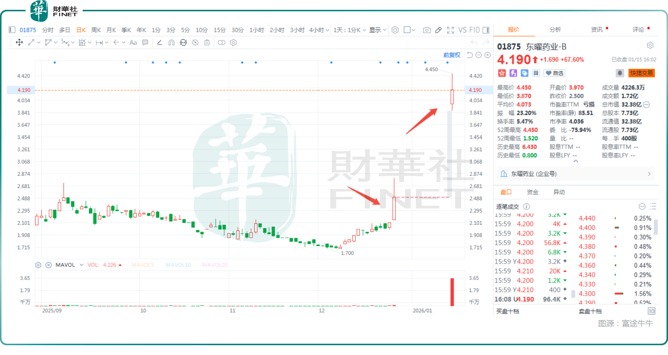 而东曜药业的股价于1月15日复牌,直接放量飙升了67.6%,收于4.19港元,已经超过收购要约价。