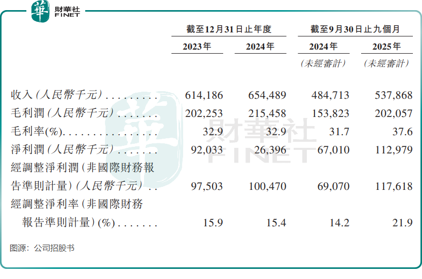 首先是利润波动剧烈的问题。招股书数据显示,公司营收保持稳健增长,2023年至2024年营业收入分别为6.14亿元(单位人民币,下同)和6.54亿元;2025年前九个月营收达5.38亿元,延续增长态势。但利润表现却大起大落,2024年公司净利润仅2639.6万元,同比大幅下滑超七成。