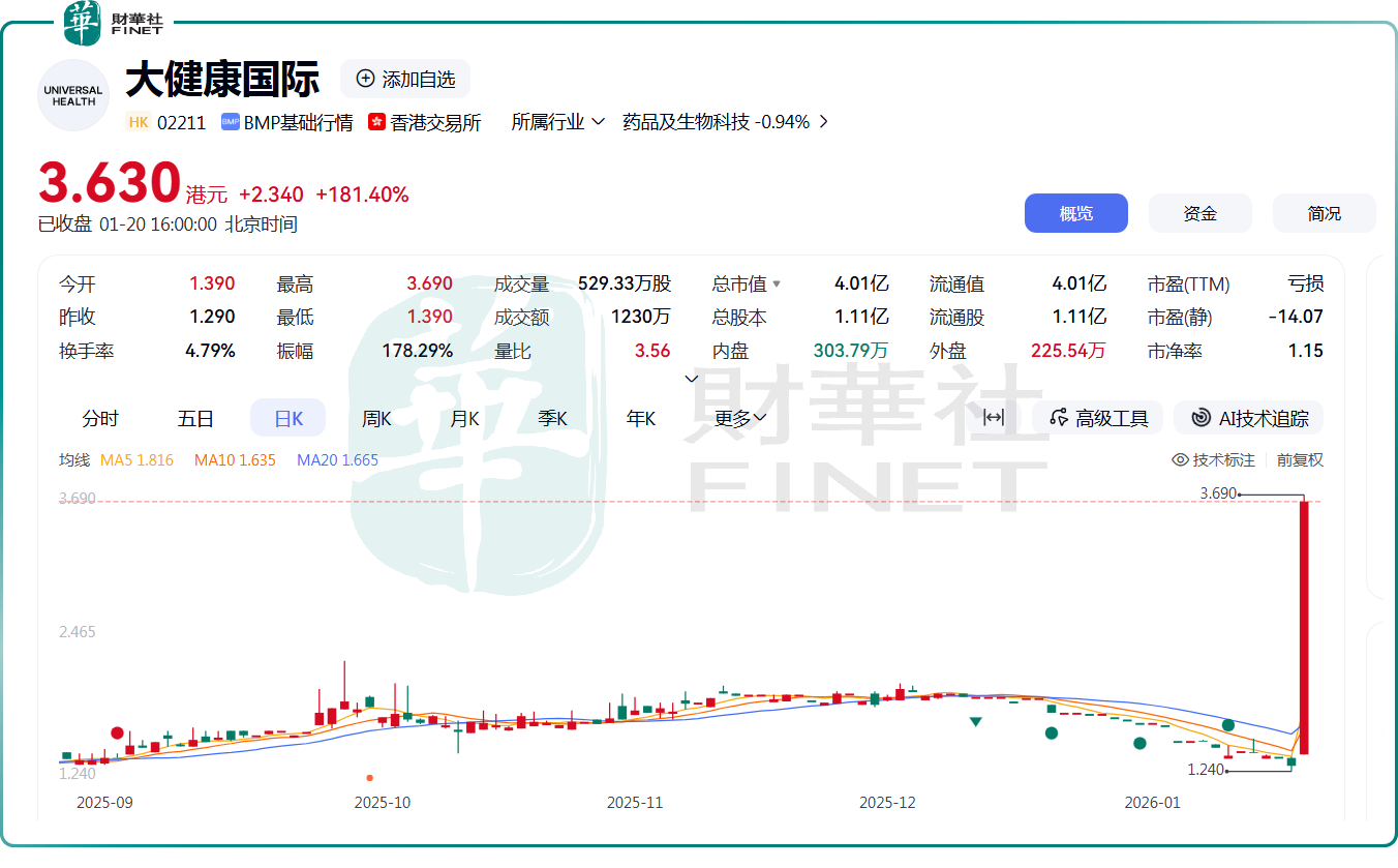 1月20日,在港股整体走弱的市况下,$大健康国际(02211)$ 突发异动,股价大幅拉升,截至收盘涨幅扩大至181.4%,报3.63港元/股,引发市场广泛关注。