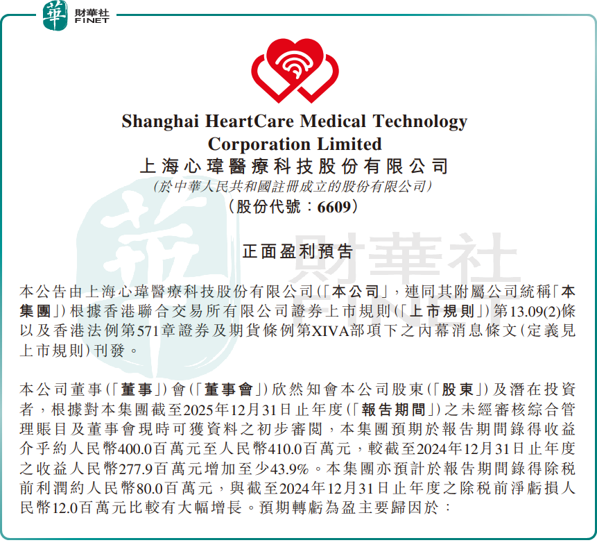 1月20日,心玮医疗发布正面盈利公告,预计2025年实现收益约4亿元至4.1亿元(单位人民币,下同),同比增加至少43.9%;除税前利润约8000万元,而2024年亏损1200万元,扭亏为盈。