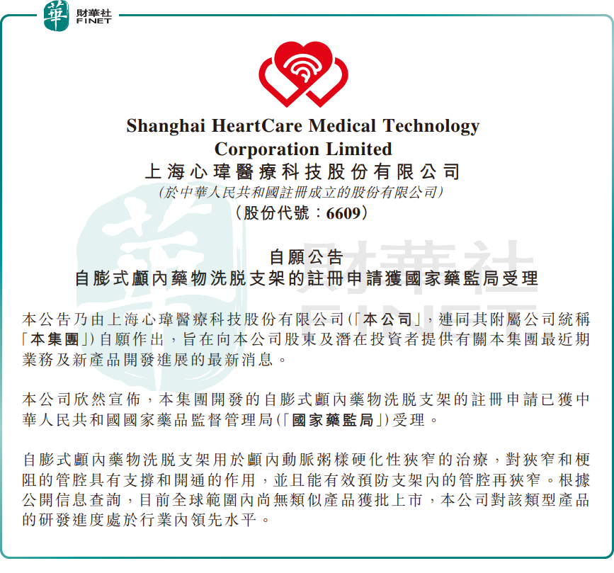 1月20日,心玮医疗宣布,旗下开发的自膨式颅内药物洗脱支架的注册申请已获国家药监局受理。