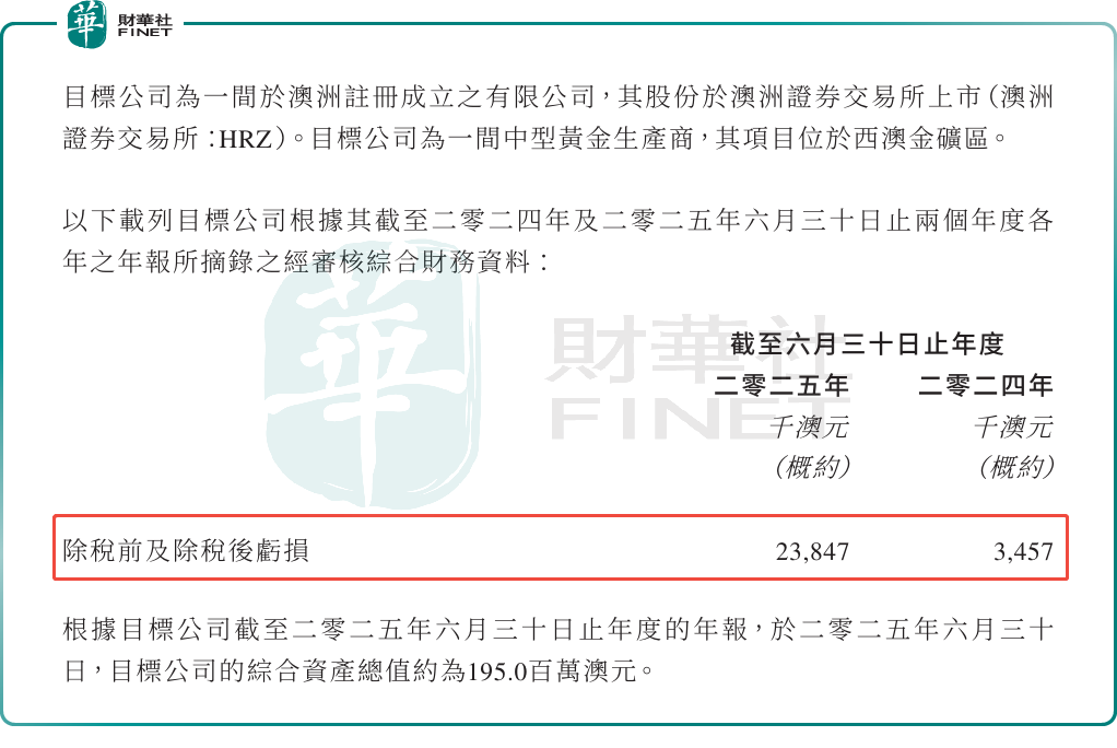 但财华社发现,标的公司的经营现状仍有隐忧。财务数据显示,Horizon Minerals 2025财年(截至6月30日)净亏损高达2384.7万澳元,较2024财年亏损额345.7万澳元,亏损正在扩大。