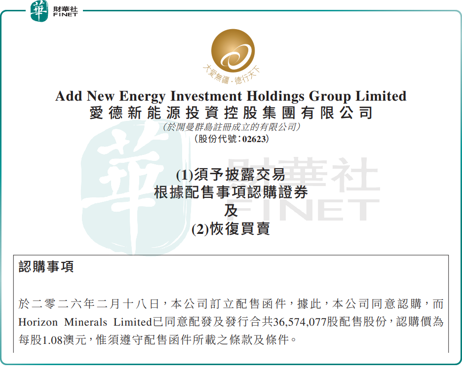 2月23日,爱德新能源发布公告称,于2026年2月18日,公司订立配售函件,拟向Horizon Minerals Limited认购合共约3657.41万股配售股份,认购价为每股1.08澳元,总代价约3950万澳元。