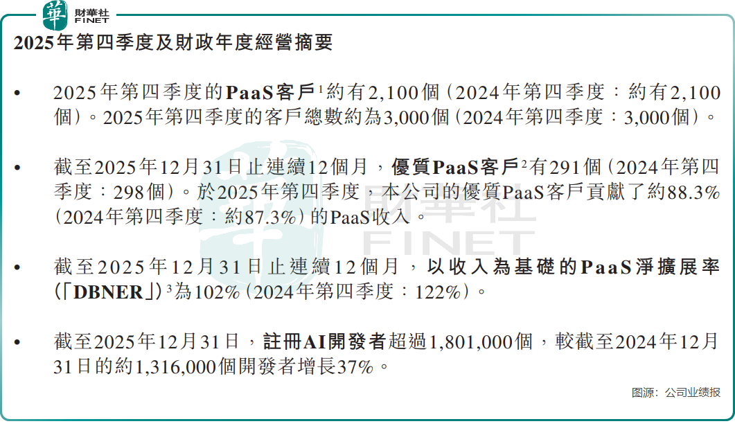 然而光鲜数据背后,涂鸦智能在第四季度有所承压。当季总营收8450万美元,同比增速仅3.0%,显著低于全年7.8%的水平。公司核心的平台即服务(PaaS)业务成为收入增长的拖累,单季收入6010万美元,同比仅增1.4%,客户数量维持在2100个的水平,增长陷入停滞。Paas净扩展率(DBNER)从2024年四季度的122%放缓至2025年全年的102%,反映出现有客户的收入增长弹性暂时减弱。