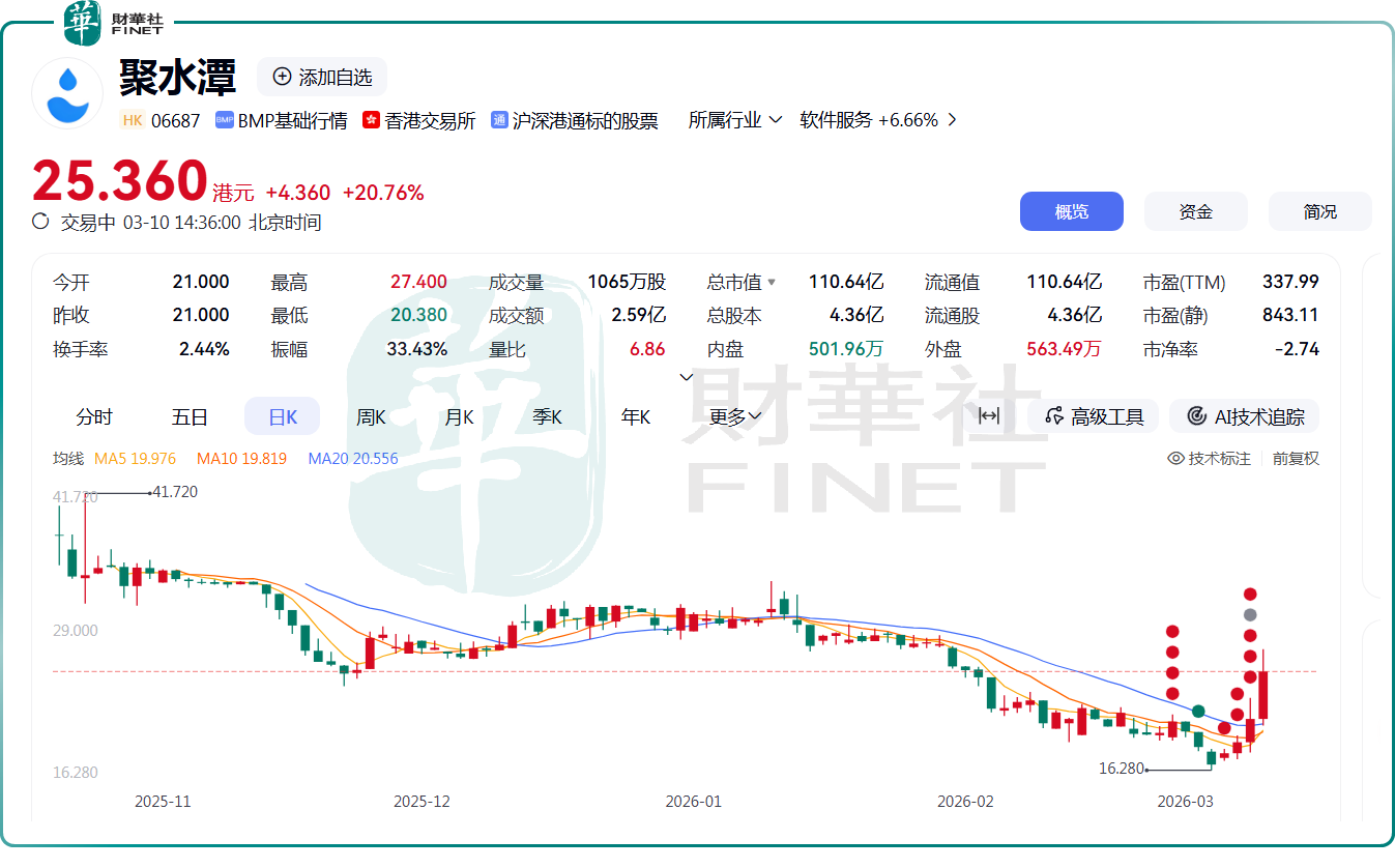近日,港股电商领域的SaaS厂商$聚水潭(06687)$ 走出了一波稳健的升势。3月10日,该股再度大幅拉升,截至发稿前,该股涨幅扩大至20.76%,报25.36港元/股,近4个交易日累计上涨超50%。