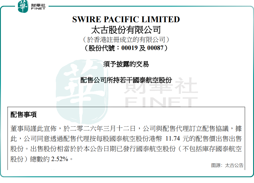 3月13日早间,太古股份一纸公告引发市场震动:公司拟以每股11.74港元的价格,配售1.53亿股国泰航空股份,套现所得款项净额约17.89亿港元。配售价较3月12日收市价12.99港元折让约9.6%,较前五日平均收市价折让约8%。