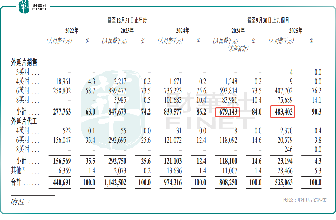 数据显示,公司的外延片销售收入占比从2022年的36.7%提升到了2025年前三季度的92.3%,外延片代工的收入占比则从2022年的63.3%降至2025年前三季度的7.7%,可见瀚天天成对于外延片销售这项业务的依赖性在持续提升。