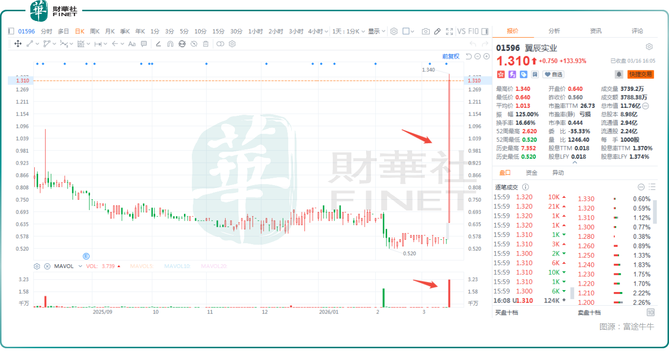股价暴涨的核心导火索,正是3月13日(周五)盘后翼辰实业发布的正面盈利预告——这份公告直接把市场预期从“亏损”拉到了“大赚”,堪称“极限反转”。