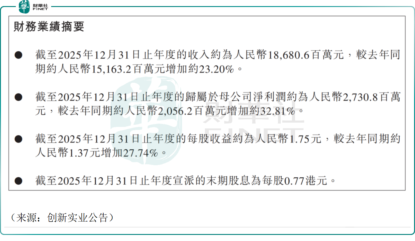 业绩方面,2025年创新实业实现营收约186.81亿元(人民币,下同),同比增长23.20%;归母净利润约27.31亿元,同比大增32.81%;每股基本收益1.75元,同比增长27.74%,盈利能力显著提升。