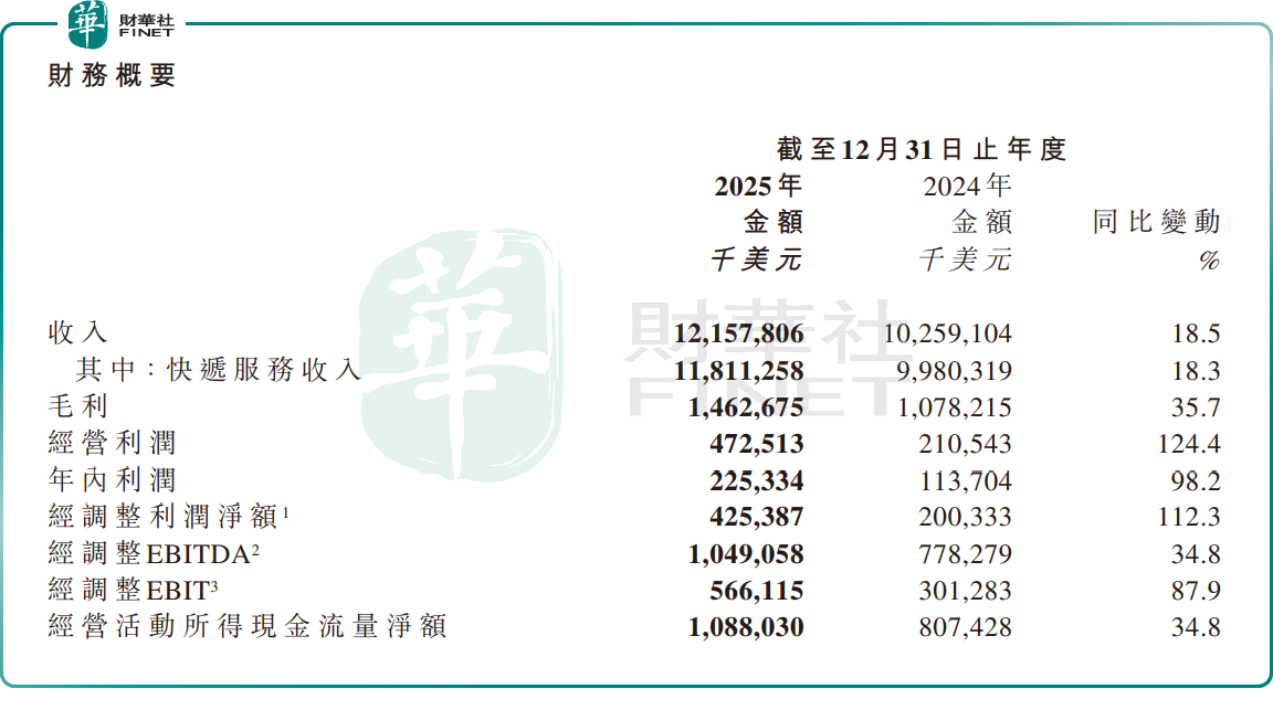 数据显示,2025年,极兔速递实现收入121.58亿美元,同比增长18.5%。其中,快递服务收入118.11亿美元,同比增长18.3%。