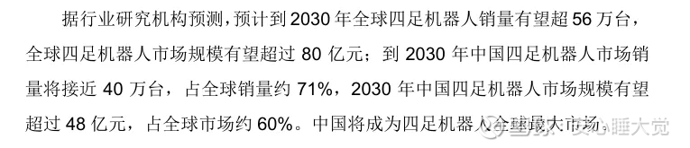 2030年,国内四足机器人规模48亿,人形机器人380亿。按照这个行业预测估计总市值千亿以上比较高估。