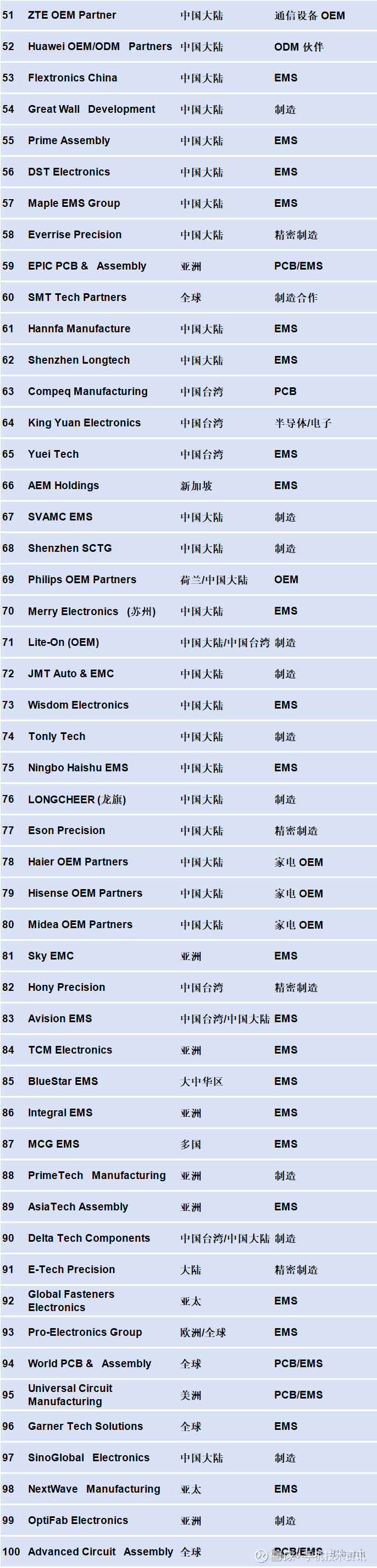 全球电子制造服务厂商排行榜(Top100)