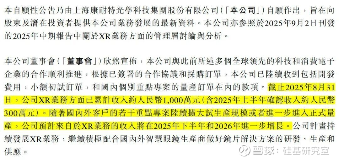 据康耐特光学最新业绩披露,其目前已陆续收到包括开发费用、小额初试订单和国内个别重点专案的量产订单在内的款项,截止2025年8月31日,公司XR业务已累计收入约1000万元,包括2025年上半年确认收入的300万元。