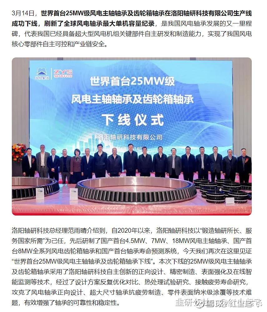 由东方电气集团研制的全球最大26兆瓦级海上风力发电机组成功入选,其传动链核心部件主轴轴承和齿轮箱轴承由洛阳轴研科技和东方风电联合研制,实现了关键零部件的自主可控,标志着我国风电轴承技术已达到世界领先水平。